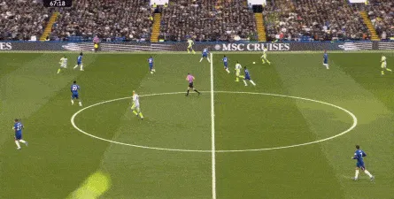 丢球了,切尔西在主场总该有些变化了吧,你不能说没有,这体现在他们的前场逼抢力度稍有提高,但并没有提高到足以干扰曼城后场球员起脚质量的高度,所以曼城反而打出了两次不错的打身后,这就把切尔西又给打回去了: