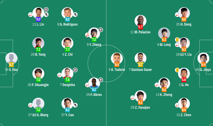 中场:11-林良铭(64'19-乃比江-莫合买提)、6-池忠国、7-塞尔吉尼奥(71'28-李睿跃)、8-古加(F)、37-曹永竞